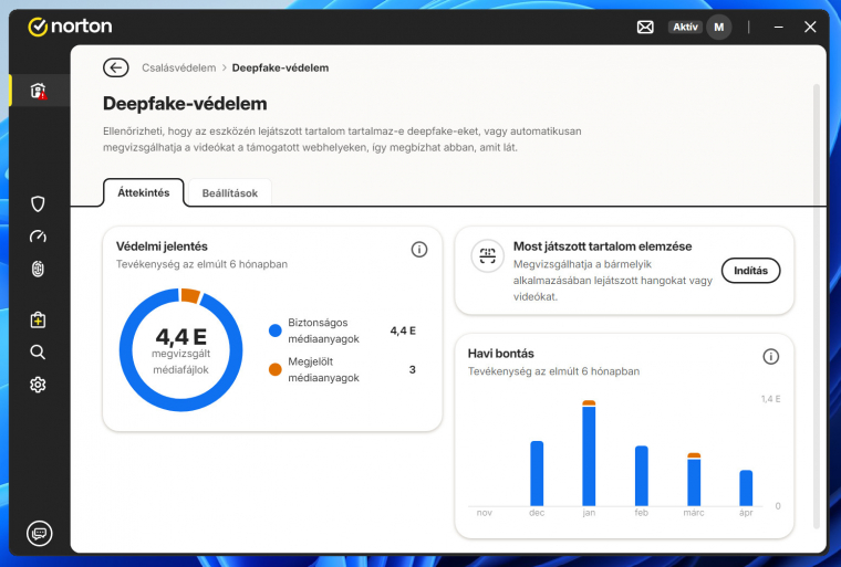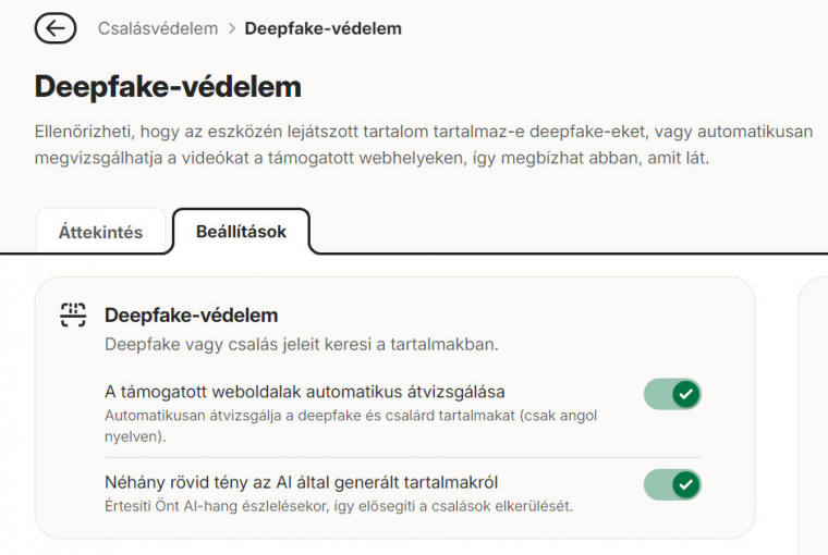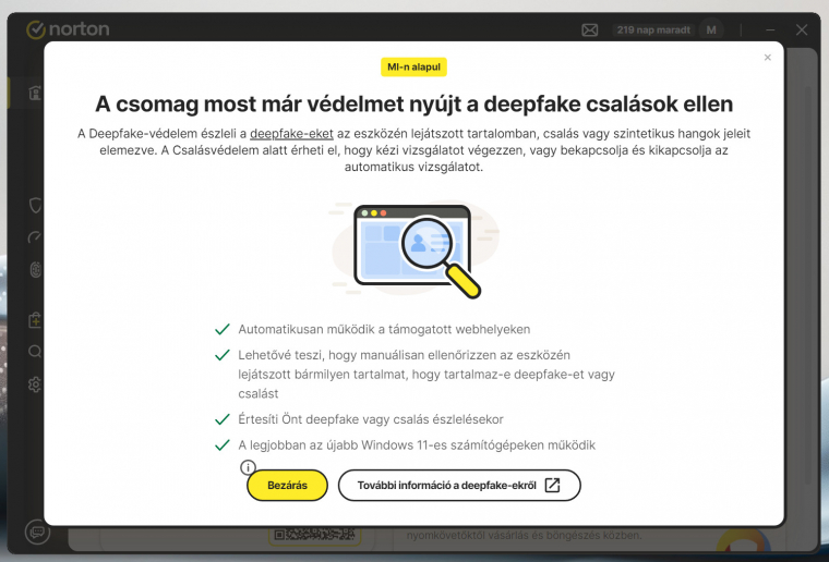 Itt lehet bevetni a Norton 360-ban megjelent Deepfake-védelmet. Ez a modul automatikusan aktiválódik minden olyan PC-n, amiben legalább 8 GB RAM és 6-magos processzor található, vagy AI-PC-ként hitelesített (dedikált AI-gyorsító chipet is tartalmaz). A modul automatikusan átvizsgálja a lejátszott tartalmakat a támogatott weboldalakon és azonnal riaszt, ha átverés-gyanús tevényekséget érzékel. Akkor is jelent, ha a AI-hangot észlel, ezzel is megnehezítve a szofisztikált csalásokat (például egy ismerősünk, vagy népszerű közszereplő hangjával próbálnak átverni és pénzt kicsalni).