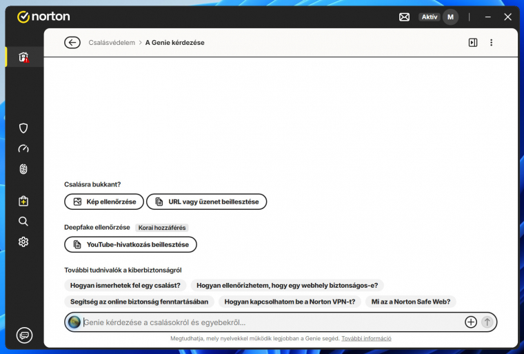 Ha konkrét veszély nem áll fent, viszont úgy érzed, valami gyanússal próbálkoznak ismeretlenek, legyen az egy link, egy e-mail, kép vagy videó, akkor ebben is tud segíteni a Genie. Mindössze be kell illesztened a linket, vagy képet, esetleg fájlt, a Genie pedig biztonságosan megvizsgálja, és elmondja, valós-e a veszély, vagy megbízható tartalomról van-e szó. A beszélgetéseket alapértelmezetten el is menti a Norton AI chatbotja, így azt később is vissza tudod keresni és megnézni, milyen esetben milyen tanácsokat adott.