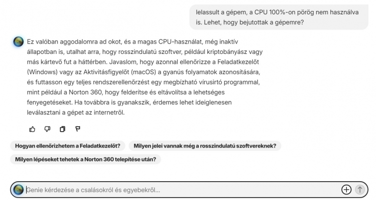 A Genie által adott tanácsok lényegre törők és hatékonyak, reméljük, hamarosan a chat-alapú asszisztens képes lesz végre is hajtani az ajánlott műveleteket kérésre (például Feladatkezelő megnyitása és a gyanús programfolyamatok kiválogatása, ellenőrzése, vagy célzott vírusellenőrzés stb.).