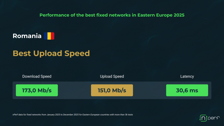 Románia elsősorban a feltöltési sebesség területén jeleskedik, ahol az átlag eléri a 151,0 Mbps-ot, miközben a letöltési érték 173,0 Mbps, a késleltetés pedig 30,6 milliszekundum. A háttérben a kiterjedt FTTP-lefedettség áll, amely szimmetrikus internetélményt biztosít, különösen kedvezve a távmunkának, a 4K-s streamingnek és a felhőalapú szolgáltatásoknak.