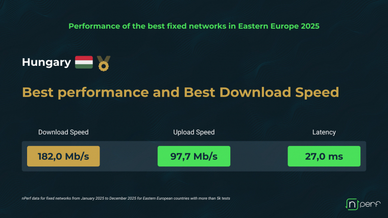 Magyarország átlagosan 182,0 Mbps letöltési és 97,7 Mbps feltöltési sebességgel, valamint 27 milliszekundumos késleltetéssel vezeti a rangsort, ami európai összevetésben is kimagasló eredménynek számít. Az adatok egy olyan modern infrastruktúrát tükröznek, amely hatékonyan ötvözi az optikai hálózatokat és a legújabb generációs DOCSIS 3.1-es kábeltechnológiát. Az nPerf vezérigazgatója, Renaud Keradec szerint Magyarország jó példája annak, hogyan hozhat kézzelfogható eredményeket egy ambiciózus hálózatfejlesztési stratégia és a következetes modernizáció.