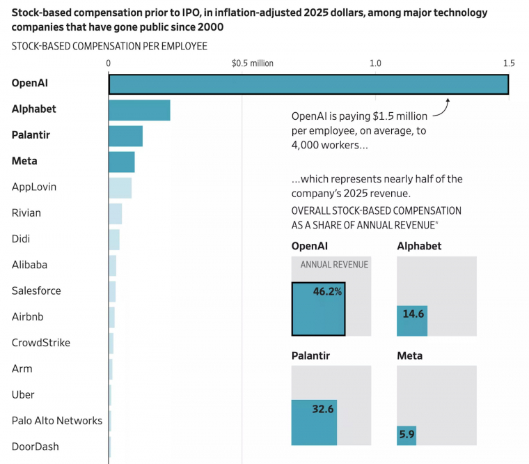 A Wall Street Journal összeszedte, hogy melyik cégnél mennyi részvény-alapú kompenzációt kaptak az alkalmazottak azelőtt, hogy az adott vállalat a tőzsdére került volna. A lenti grafikonon látható számok alapján kimondható, hogy az OpenAI kifizetése harmincnégyszerese a tipikus, részvénykibocsátás előtti kompenzációnak.