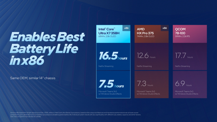 Alapvető mérnöki gondolat, hogy a jobb energiahatékonyság a gyakorlatban hosszabb akkumulátoros üzemidőt jelenthet. Az Intel adatai szerint egy Panther Lake alapú referencia-notebook kb.16,5 órányi folyamatos Netflix videólejátszást is kibír egy töltéssel, szemben egy hasonló kategóriájú AMD Ryzen laptop nagyjából 12 és fél órás eredményével. Az új architektúra első ránézésére tehát nemcsak erősebb, de takarékosabb is elődeinél, ami fontos szempont lehet pl. a Qualcomm friss PC-s platformja ellen.