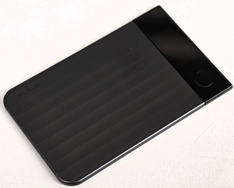 A Plaud Note Pro egy meglepően vékony és elsőre törékenynek tűnő, valójában azonban igen masszív, kb. bankkártya-méretű eszköz. A 3 mm-es vastagság a készülék teljes egészére igaz, nincsen kitüremkedő rész. A borítás alumínium, kétféle színben érhető el, és mivel Pro verzió, egy apró kijelző is helyet kapott rajta. A kezelés egyszerűbb nem is lehetne, hiszen mindössze egyetlen gomb került rá, amit ha megnyomsz, a készülék működik, ha még egyszer megnyomod, leáll. Ki/bekapcsolással nem kell bajlódnod, a készenléti idő 75 napos. A kijelző OLED-paneles, 0,95 colos és színes, de csak a legszükségesebb információkat jelzi ki és gyorsan elalszik, nem árulkodik mindenféle színes effektekkel, animációkkal használat közben.