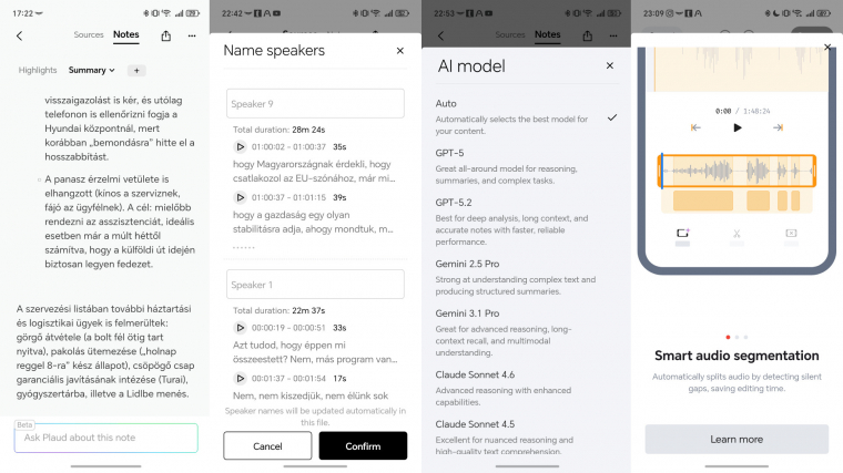 A készülék ezután minden felvételt követően, az app indításakor feltölti a mobilodba a hangfájlokat, amiket itt végig is tudsz hallgatni. A varázslat azonban csak itt kezdődik. A Plaud AI-t egyetlen gombnyomással ráengedheted a hangfájlodra, így saját fejlesztésű LLM-et bevetve a felvétel hosszától függően a gyártó rendszere kielemzi a teljes felvételt, amiből teljes átiratot készít a beszélők megkülönböztetésével. Itt nevet is adhatsz az elválasztott résztvevőknek, ami nagyban leegyszerűsíti a szöveg kielemzését. Fontos még az is, hogy amennyiben felvétel közben megnyomtad (akár többször is) a készülék gombját, azt a részt automatikusan kiemeli, mint fontos szakaszt.