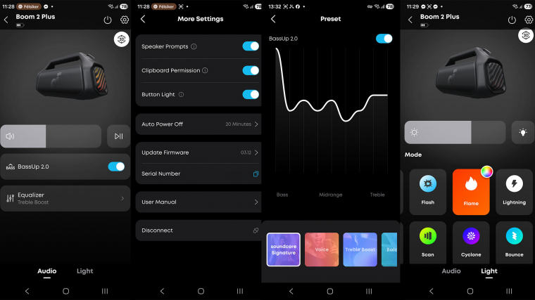 Ahogy azt már említettük, alapbeállítások mellett a soundcore signature hangzás szerint szólal meg a hangfal, ha pedig a BassUp 2.0-t is aktiválod, akkor az alsó tartomány a plafonig van húzva. Nos, nem számítottunk audiofil hangzásra, de ezzel a beállítással nem szól jól a Boom 2 Plus. A mély bántóan sok, a közepeket teljesen elnyomja, a magasak pedig cincognak. Szerencsére a helyzet nem reménytelen, sőt, elég, ha egy másik profilra váltasz, majd ezt igazítgatod saját zenei stílusodhoz/ízlésedhez. Ha ezt a kb. 1-2 perces feladatot elvégzed, határozottan sokat javíthatsz a hangzáson. Sokkal több tér juthat a közepeknek, tisztábban is fognak szólni, a magas sem cincog annyira. A mélykiemelést is kikapcsolhatod, basszus még így is marad, viszont ezzel kicsit erőtlenebbé válik a hangfal, különösen kültéren talán jobb bekapcsolva tartani a BassUp-ot.