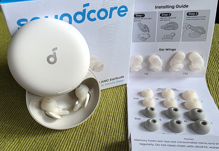 A soundcore-tól nem idegen módon a kerek, lapos tok fedelét oldalra tudod eltolni, így bukkan elő a két füldugó, amelyeket kérheted fehérben vagy világoszöldben. Maga a fülhallgató teljes készülékháza kisebb, mint a szilikonharang, amit a hallójáratodba kell illeszteni lefekvés előtt. Ám nem csupán ez, hanem egy, a teljes füldugót körbeölelő szilikongyűrű is került a Sleep A30-ra, amelyet úgy alakítottak ki, hogy beleilleszkedjen a füledbe, ezzel stabilizálva a füldugó helyzetét. Ez a "fog" alakú kitüremkedés is levegővel töltött, hogy még ráfekvéskor se nyomja a füledet.