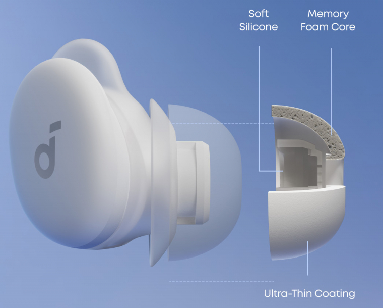 A zajszűrést a fent már említett szilikonharangok és szilikon rögzítőgyűrűk is elősegítik, itt viszont biztosra akart menni a soundcore, ezért XS-L között többféle méretet is választhatsz. Érdemes kitapasztalni, hogy melyik a kényelmes, pláne akkor, ha az oldaladon alszol legtöbbször. A szilikonharagokból kétféle sorozatot is találsz a dobozban: az egyik hagyományos, a másikba pedig extra szivacsréteg is került, hogy már passzívan is minél több zajt szűrjön ki.