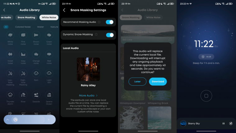 Ami viszont van, az tényleg lenyűgöző. Az iOS-en és Androidon is elérhető soundcore appon belül a Sleep A30 esetében minden az alvásminőség javításáról szól. Az applikációban be kell állítanod az ébredés várható időpontját, valamint kiválasztani a kívánt háttérzajt - már ha szeretnél ilyet. Itt a választék óriási, van vihar, eső, tengerpart, nyüzsgő, távoli város zaja, erdőben a falevelek suhogása, távoli zápor és még folytathatnánk. Van mindenféle alapzaj is, fehérzaj, színeszaj, tábortűz, vonat, repülő, különböző madarak, bogarak hangjai, mosó- és szárítógép távoli hangja,