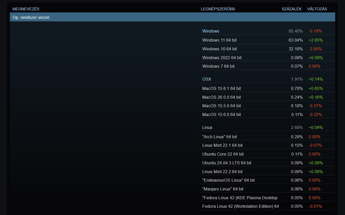 A Linux azonban csak 0,04 százalékpontot erősödött, jelenleg 2,68%-on áll, így nem történt számottevő mozgás ezen a fronton. A disztribúciók közül továbbra is Arch vezet, amit a SteamOS alapjaként ismerünk, utána a Linux Mint és az Ubuntu variánsok következnek. A macOS még a Linuxnál is nagyobb, 0,14 százalékpontos növekedést produkált, amivel 1,91%-ra kapaszkodott, de a Windows összesített részesedése mindezek után is elsöprő maradt: a Microsoft rendszerei összesen 95,40%-ot birtokolnak a tortából.