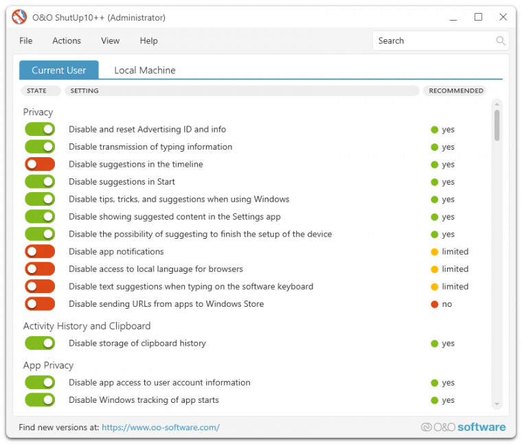 Az O&O ShutUp10++ a legismertebb eszköz a kategóriában, és nem véletlen - az O&O egyik ingyenes eszközéről van szó, amely a profiknak a beállítási lehetőségek számával kedvez, a kezdőknek pedig azzal, hogy minden egyes funkcióhoz egy rövid magyarázat is tartozik. Az alkalmazást még csak telepíteni sem kell, elég letölteni majd kicsomagolni, és máris használatba veheted. A program kategóriákba sorolva tárja eléd azokat a beállításokat, amiket megváltoztathatsz: biztonság, adatvédelem, frissítések és rendszerfunkciók között tudsz elmerülni. Az egyes paraméterekhez még kockázati besorolás is tartozik, ami alapján könnyebb eldönteni, hogy akarod-e az adott beállítást megváltoztatni vagy mégsem. Ha szeretnéd, a beállítások módosítása előtt egy visszaállítási pont is készíthető a programmal, így ha valami balul sül el, pillanatok alatt visszaállíthatod a kiindulási állapotot.