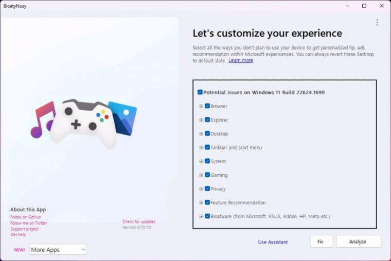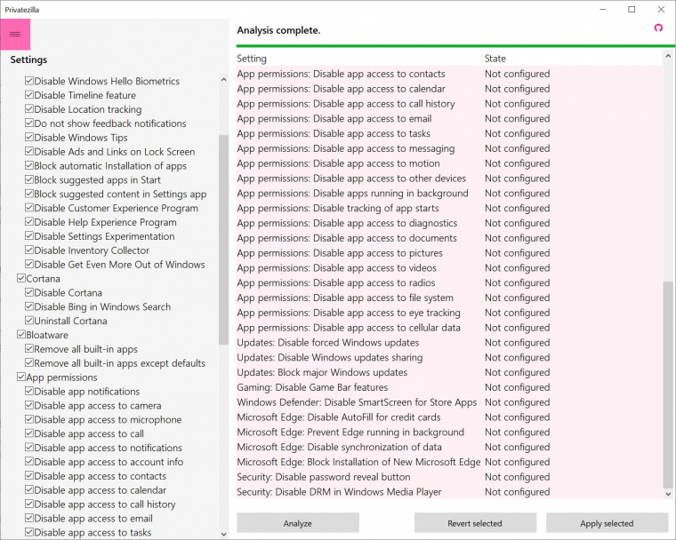A BloatyNosy nemcsak adatvédelmi beállításokat kínál, hanem eltávolíthatók vele azok az alkalmazások is, amiket a rendszerrel együtt kaptál, de nem szeretnéd használni őket. Moduláris felépítésének köszönhetően kezelőfelülete jól átlátható: külön szekciókban jelennek meg a rendszerparaméterek, az eltávolítható alkalmazások és azok az opciók, amikkel a teljesítményt tudod finomhangolni. Óriási előnye, hogy gyakran frissül, így a Windowsban megjelenő új funkciók hamar megjelennek benne. A profik értékelni fogják, hogy akár még szkriptek is létrehozhatók. Hátrány viszont, hogy fontos rendszerfunkciókat is megpiszkálhatsz vele, ezért állítgatás előtt a legjobb, ha készítesz biztonsági másolatot a rendszerről.