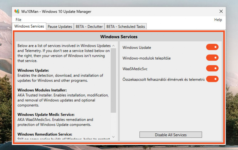 A Wu10Man eredetileg a Windows 10 rendszerfrissítéseihez kapcsolódó beállítások kezelésére készült, de működik Windows 11 alatt is - azonban az előfordulhat, hogy nem minden opció hatásos, mert a Microsoft elég agresszíven erőlteti a frissítési csomagok telepítését, és ezért változtatni is hajlandó a háttérfolyamatok működésén. A Wu10Man segítségével a frissítések kikapcsolhatók vagy késleltethetők, így nem kell tartanod például attól, hogy a PC-t muszáj újraindítani. Kezelőfelülete egyszerű: kapcsolók segítségével vezérelheted a Windows Update szolgáltatások, ütemezett feladatok és csoportházirendek működését. Leginkább azoknak ajánlott, akik stabilitást és kiszámíthatóságot keresnek, például munkahelyi vagy kritikus környezetben, ahol a váratlan frissítések komoly problémát okozhatnak.