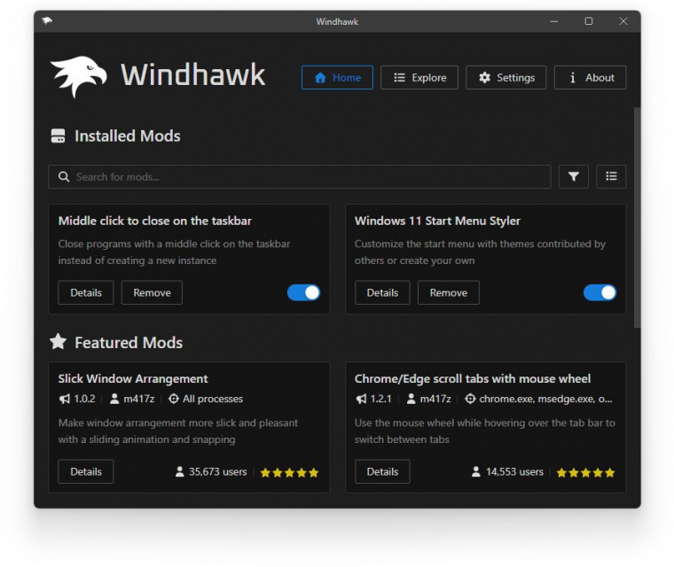 A Windhawk maga csak egy platform, amely segítségével a Windowshoz készített közösségi módosításokat tudsz letölteni, apróbb változtatásokat hozva el ezzel a rendszerbe. Előnye, hogy mindig csak annyira nyúl bele a rendszerbe, amennyire feltétlenül muszáj: a shell teljes cseréje helyett izolált, célzott módosításokkal operál, így nemcsak biztonságos használni, hanem előnyként mutatkozik az is, hogy a változtatásokat könnyű visszavonni. A közösségi modok igen sokféle témát érintenek: találni közöttük Start menü javításokat, Tálca módosítást, a Fájlkezelőt érintő trükköket és így tovább.