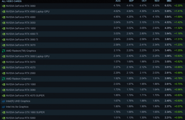 Az élvonalban nem történtek túl nagy változások: a legnépszerűbb videókártya továbbra is az Nvidia GeForce RTX 3060 6,53 százalékkal, azt pedig 4060 laptopos és asztali variánsai követik. Az 50-es és 60-as zöld lapkák továbbra is maradnak a gamerek kedvencei, és nem nehéz látni, hogy miért. A játékosok túlnyomó többsége, 53,68 százaléka még mindig 1080p-s monitorokkal rendelkezik, és bár a 1440p-s kijelzők most kaptak egy kisebb lendületet, és felkúsztak 21,77 százalékos részesedésre, a jelentős hardveres ugrást igénylő 4K továbbra is csak a piac egy elenyésző részét érdekli.
