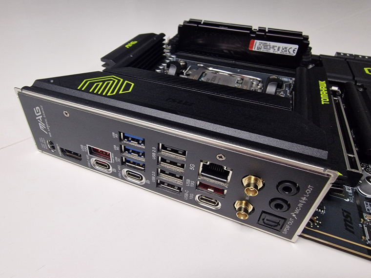 Egyébként USB-portokból összesen tizenkettőt kapsz a hátlapon, ha ezt mind feltöltöd, jár tőlünk egy elismerő biccentés. Vélhetően hamarabb fogod kihasználni az 5 GbE Realtek LAN képességeit, vagy az integrált Wi-Fi 7 vezeték nélküli vezérlőt, bár ehhez az otthoni hálózat többi komponensét sem árt fejleszteni. A vételt erősítő antenna természetesen a dobozban lapul, mint ahogy az M.2 SSD-foglalatok szerelékei, a LED-vezérléshez és LCD-kijelzőkhöz használható kábelek és a drivereket tartalmazó pendrive sem maradhatott ki a csomagból.