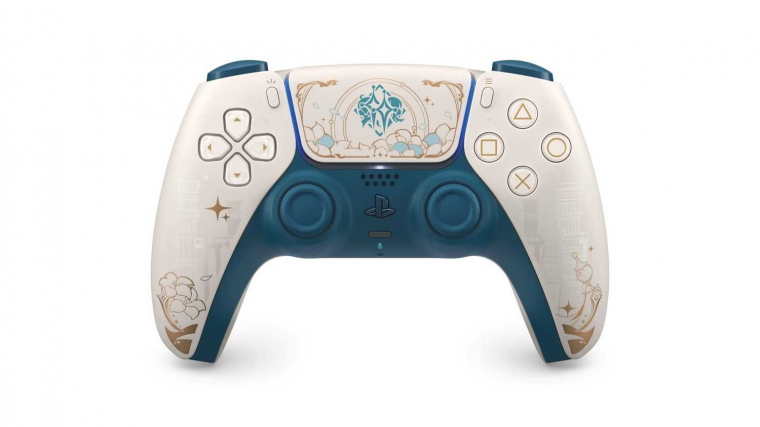A gyöngyfehér ház, kék ravaszok és analógok, valamint arany szimbólumos fehér gombok jellemezte limitált DualSense dizájnját a játék két főszereplője, Aether és Lumine, a Traveler ikerpár ihlette. Aether fülbevalója a jobb markolaton, Lumine virágai a bal oldalon kapnak helyet, a touchpadet, a Traveler csillagai díszítik, a hátlapon pedig az elsődleges kísérő, Paimon teszi teljessé a képet. Funkcióit tekintve ugyanakkor nem különbözik a sztenderd DualSense modellektől, így minden modern PS5-ös és PC-s használati funkciót támogat, beleértve a több eszközös párosítást is, amit a Sony legutóbbi firmware-e hozott be.