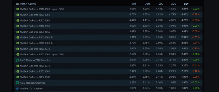 Eközben az Nvidia frontján is történt némi átrendeződés. A Steam felhasználói körében a laptopos RTX 4060 ugrott az élre, 0,22 százalékos emelkedést produkálva az előző hónaphoz képest, miközben az asztali RTX 4060 vesztett 0,6 százalékot, és emiatt az első helyről visszacsúszott a harmadikra.
