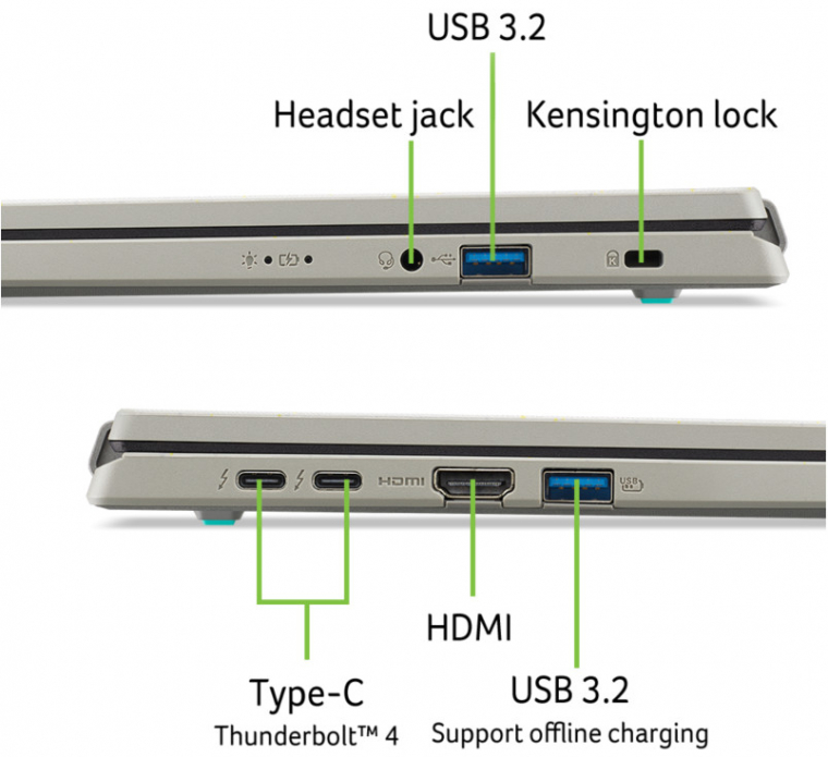 Az Acer Aspire Vero AV16 nem csupán környezetbarát, de tartós is, és ezt jól mutatja a 3 év garancia is. A gép abszolút modern, a processzornak köszönhetően a laptop Copilot-hitelesített, mindössze 16,5 mm vastag és csupán 1,8 kg. A szervizelhetőség is elsőrangú, a gép alja csavarozva van, így könnyen bontható, bővíthető, szerelhető.