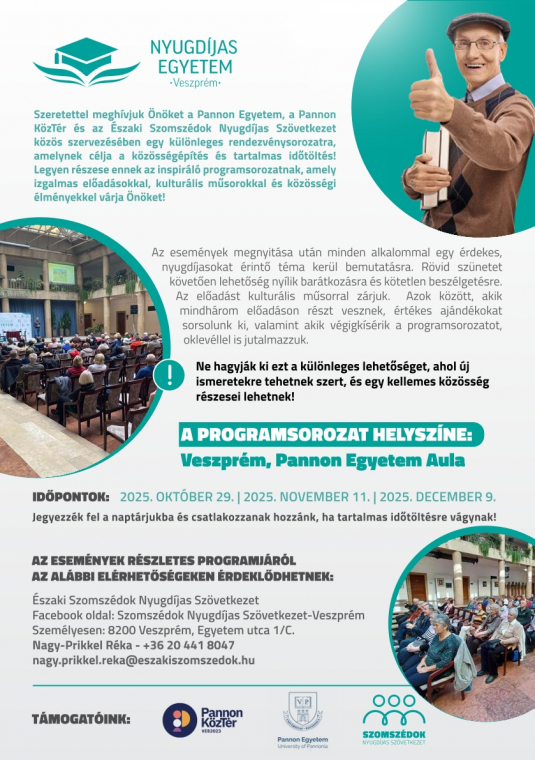 A Pannon Egyetem, a Pannon KözTér és az Északi Szomszédok Nyugdíjas Szövetkezet hosszú évek óta tartó partnersége ékes bizonyítéka annak, hogyan lehet felelős és értékközpontú együttműködéssel valódi társadalmi hatást elérni. A közös szervezésben megvalósuló Nyugdíjas Egyetem a szervezetek azon elkötelezettségét tükrözi, hogy az oktatást és a közösségépítést az élethosszig tartó tanulás és a generációk közötti hídépítés szellemében valósítsák meg.